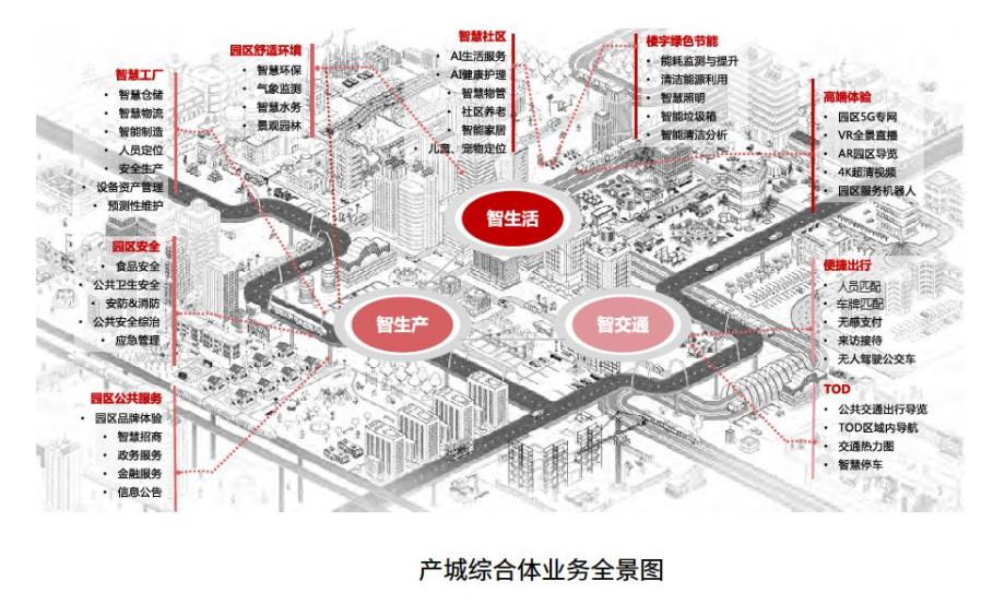 基于藍圖框架,圍繞產(chǎn)城綜合體中社區(qū)、工廠、樓宇、交通、環(huán)境、安全和公共服務等場景,可以全面勾勒出未來產(chǎn)城綜合體的全景圖(如圖所示)。